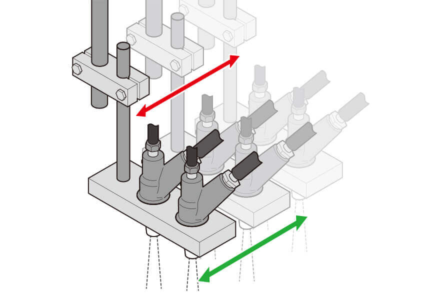 装置内を投入部側から排出部側に流れているワークを挟み込むように上下もしくは左右に配置されたノズルを振動させる事で、ブラスト加工を行います。