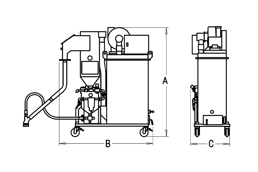 研磨材の噴射・回収・分級機構が一体となっており、キャスター可搬式の装置のため、現場まで移動をして屋外でのブラスト作業が可能です。