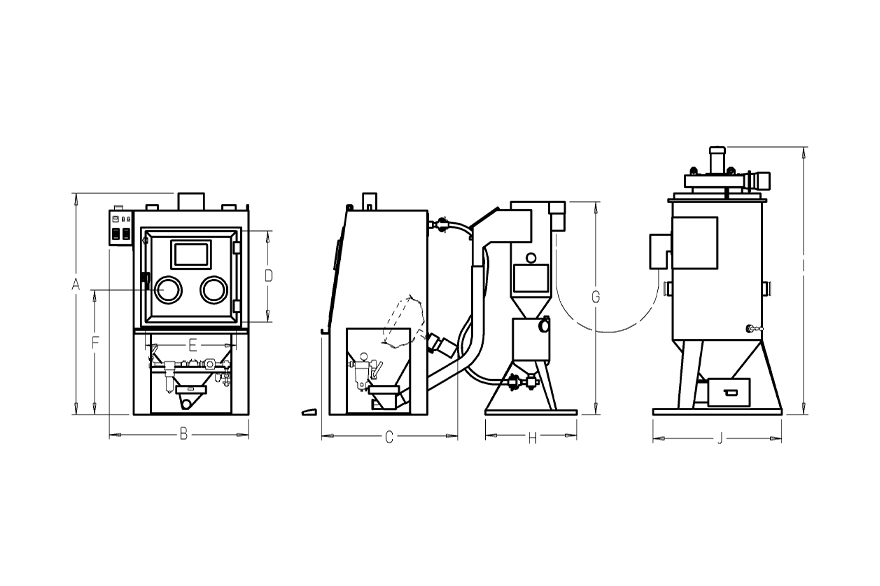 - 本体キャビネット、回収タンク・加圧タンクユニット及び集塵機(ダストコレクター)の3点で構成されている直圧式噴射機構を備えたブラスト装置です。