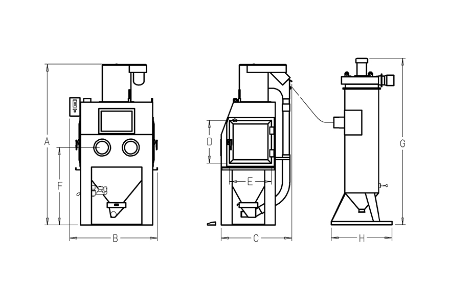 - 集塵機(ダストコレクター)が別置きタイプの本格的な産業用ブラスト装置で、この大容量集塵機が加工室内に強い下向きの気流を作り出すことで、クリアな視界でブラスト作業が可能です。
