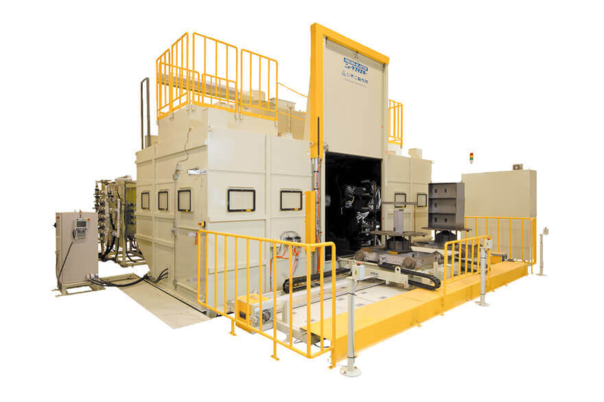 装置開口部での瞬間的なワンタッチ段取りでワーク着脱する1個流し生産ラインに適した自動機です。各ノズル毎に1回噴射量分のみの小タンクを設置し圧送噴射 (CD方式)します。更に噴射量制御機構のマグナバルブを搭載。ワーク1個に対して決まった噴射量を定量安定噴射で確実にショットピーニングすることが可能です。