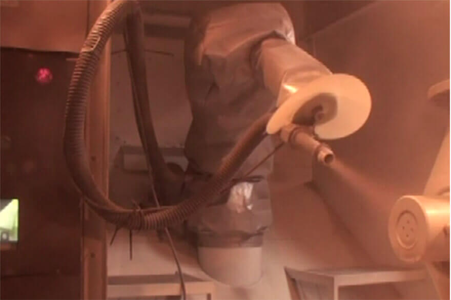 ノズルを持たせたロボットとコンピューター監視システム(AMS2432D規格に準拠)を組合せ、多彩なレシピを可能にした航空機部品向けショットピーニング装置です。ロボットがワーク毎に適したブラストガンに持ち替えるオートツールチェンジャー搭載。
